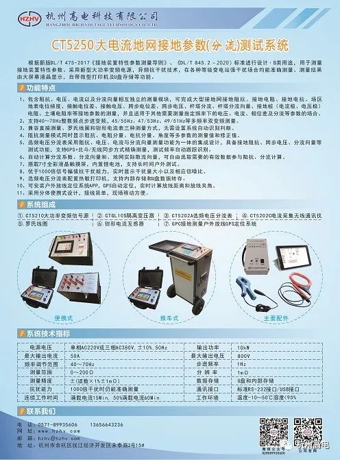 包含阻抗、电压、电流以及分流向量相互独立的测量模块,可完成大型接地网接地阻抗、接地电阻、接地电抗、场区地表电位梯度、接触电位差、接触电压、跨步电位差、跨步电压、杆塔分流、杆塔分流向量、接地桩(电流极、电压极)电阻、土壤电阻率等接地参数测量,并且适用于其他需要测量指定频率下电压、电流、相位差及分流等参数的场合。